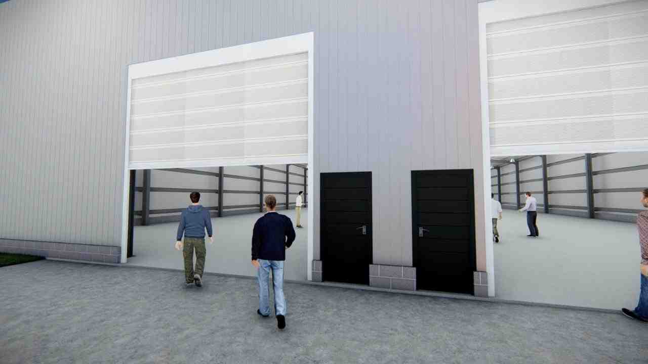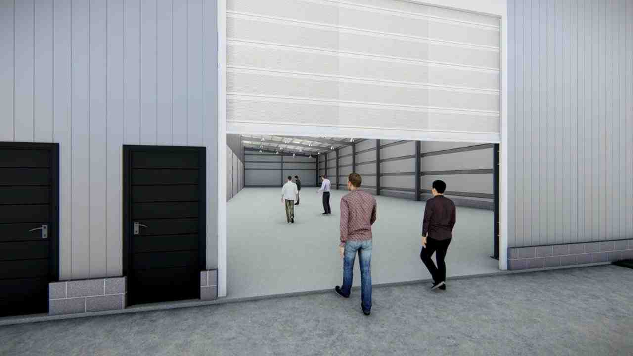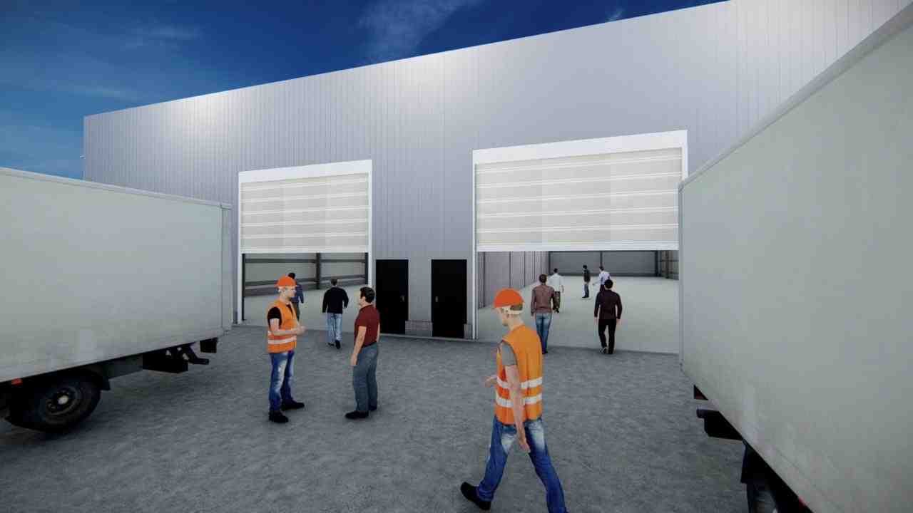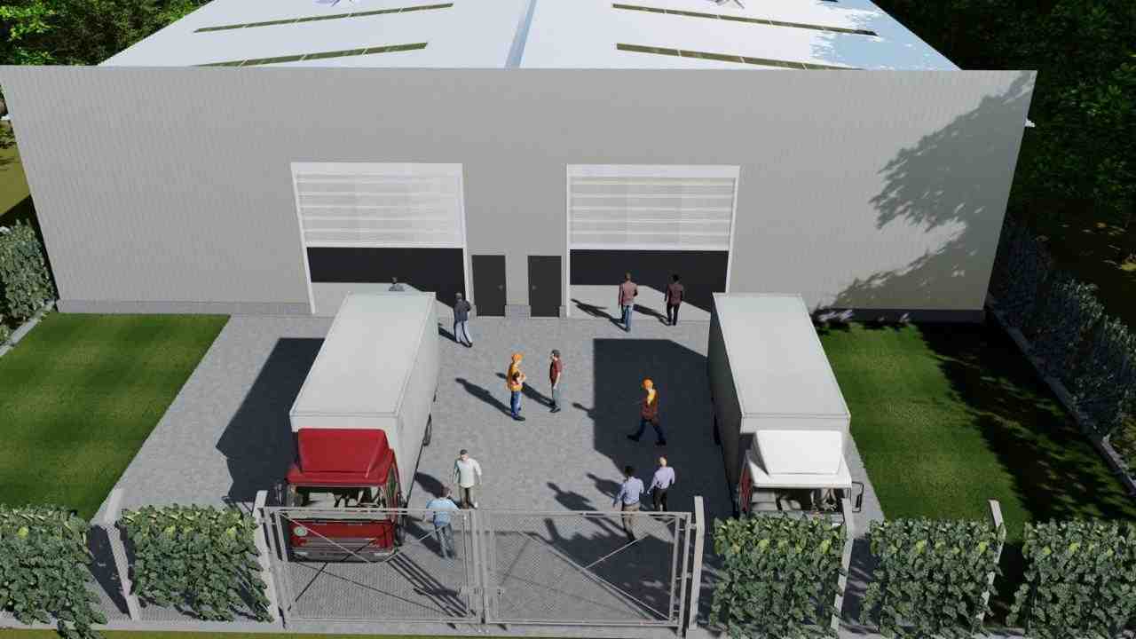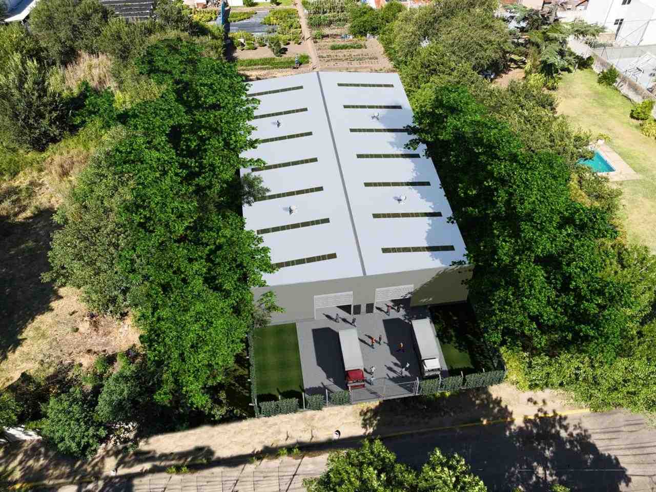 trapezoidal. Ventilación mediante extractores eólicos. Portones industriales de 5 x 5 m y accesos