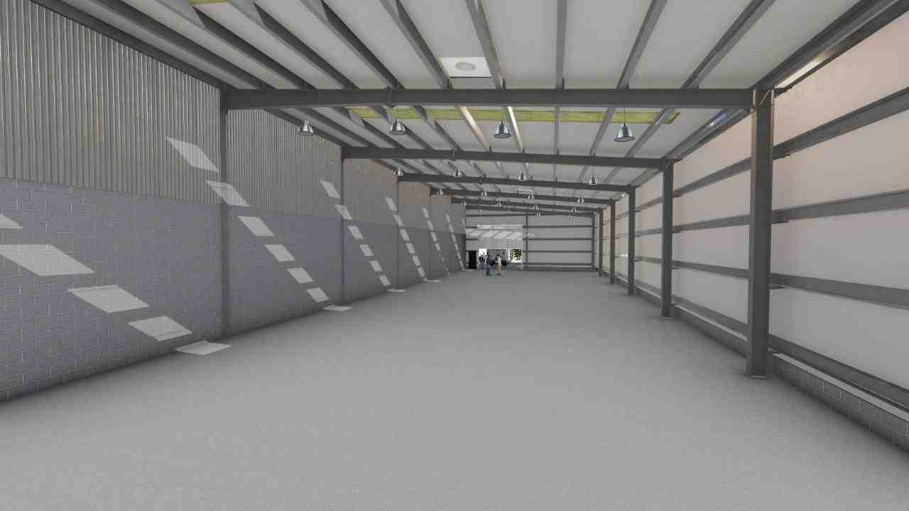 Estructura metálica normativa con pórticos en alma llena y correas galvanizadas. Cubierta de chapa